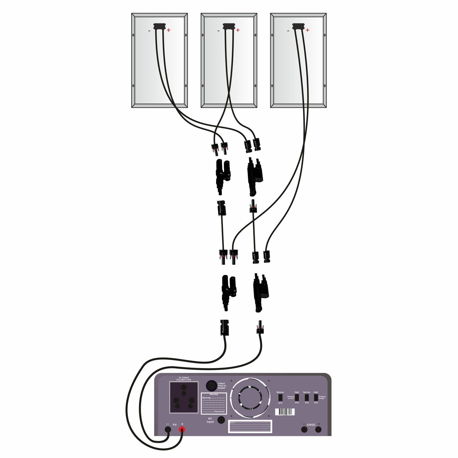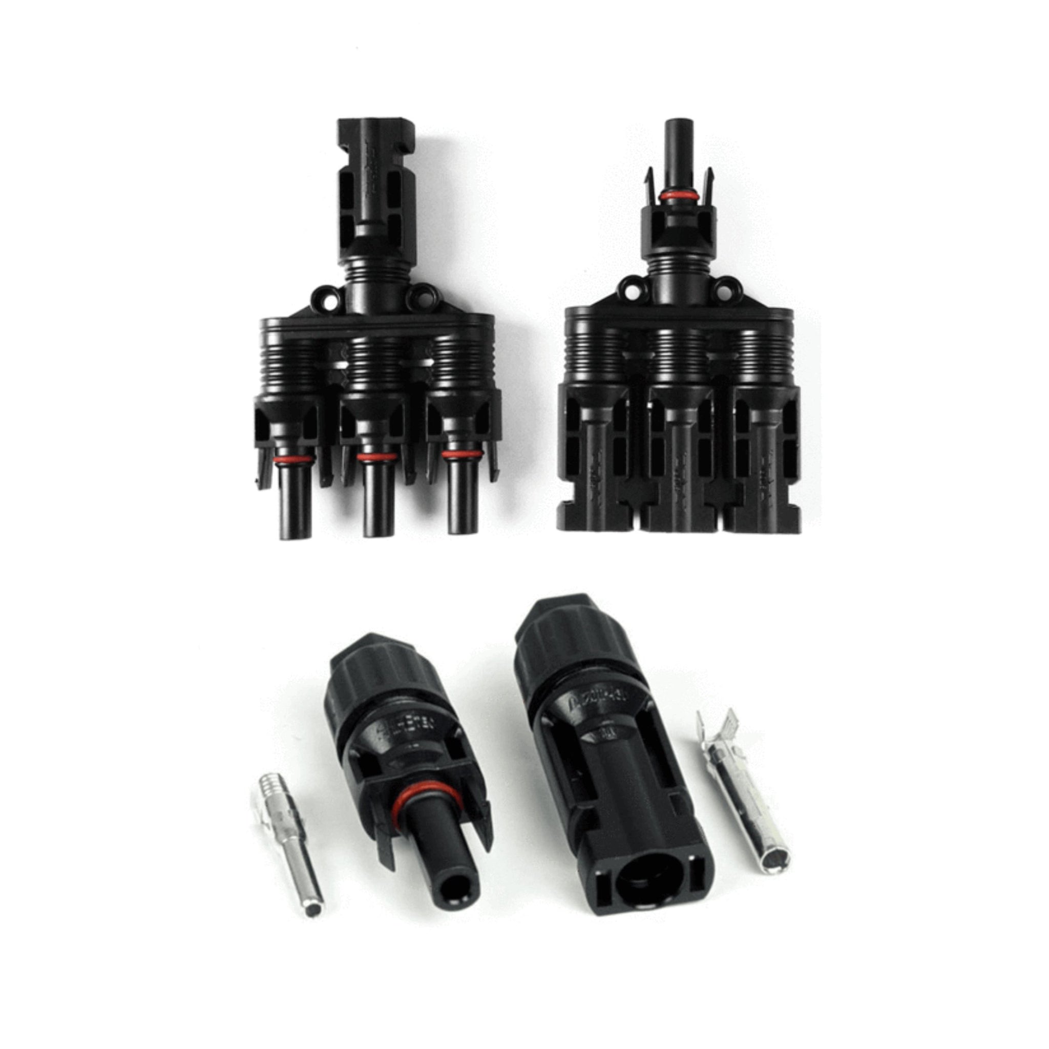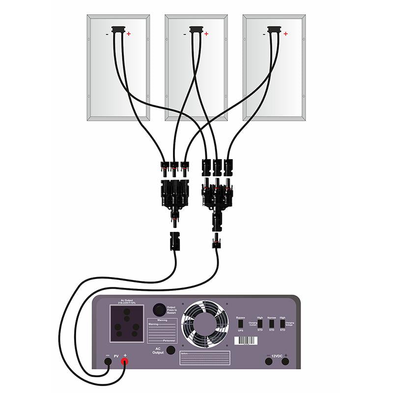 3 Panel MC4 -T type connector connects 3 solar panel from 10 watt to 400 watts. IP 67 rating makes it waterproof and dust proof for outdoor use.