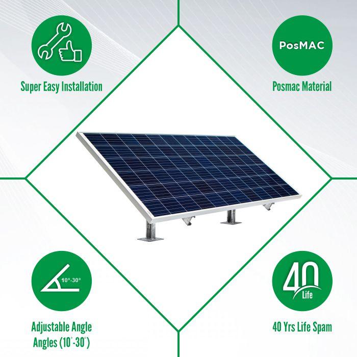 Loom solar introduces portable solar mounting structure / solar panel stand to fix 1 nos. of solar panel. A solar panel from 320 watt ~ 400 watt of any brand and any make can be installed on a home roof. The portable solar panel stand is made of galvanized iron, the rust proof solar panel stand life is is more than 25 years.