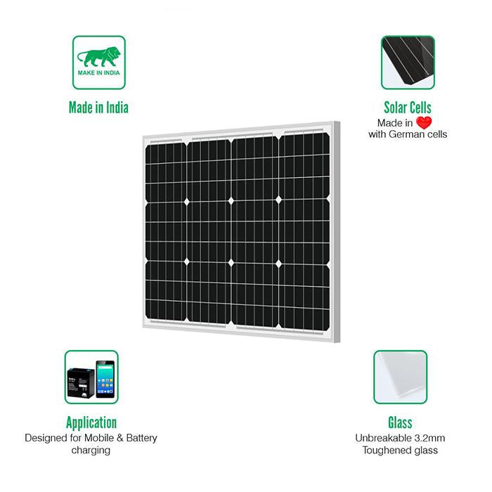 Loom Solar 50 watt mono panels are made of A grade mono perk cells and ultra cleared tempered glasses that does not break easily and gives 22% higher efficiency even in low light and cloudy weather. Loom solar is only company in india that makes mono panels using perk cells in 12 volt design. The additional feature includes 4 busbars, 36 cells and 25 years performance warranty. IP 67 rated junction box is given with MC4 compatible cable connector for higher module efficiency.